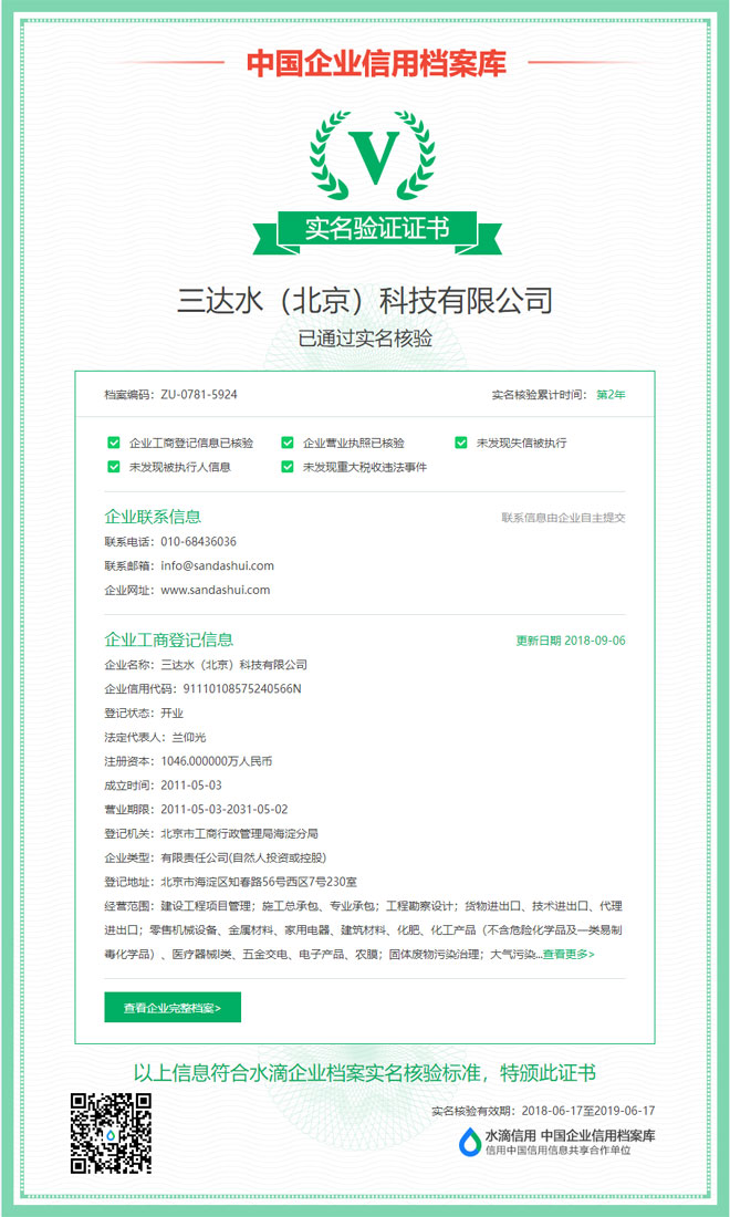 三達(dá)水加入中國企業(yè)信用檔案庫