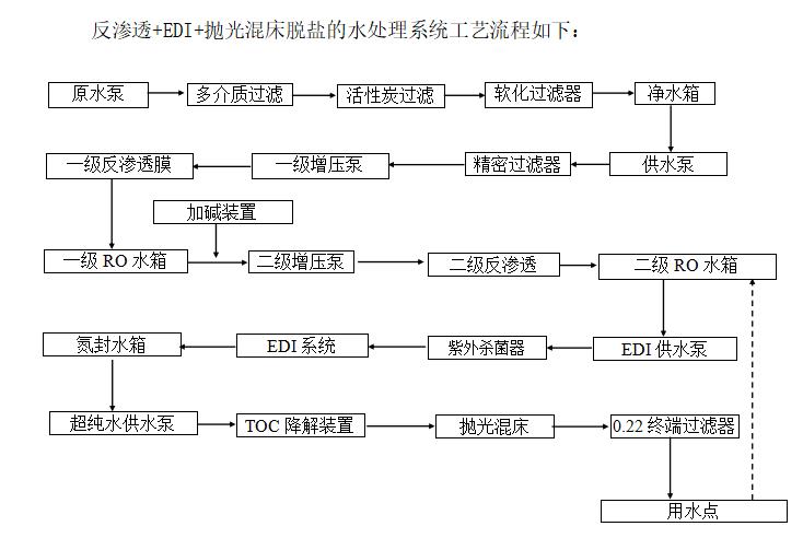 為保證關(guān)鍵設備反滲透裝置的長期可靠穩(wěn)定運行,則必須設置預處理系統(tǒng),滿足反滲透膜(RO)進水指標:濁度<0.5NTU、SDI<4、余氯<0.1ppm。根據(jù)原水水質(zhì),預處理系統(tǒng)由多介質(zhì)過濾器、活性炭過濾器、加藥系統(tǒng)及相關(guān)輔助設備組成。 反滲透+EDI+拋光混床脫鹽的水處理系統(tǒng)工藝流程如下: |